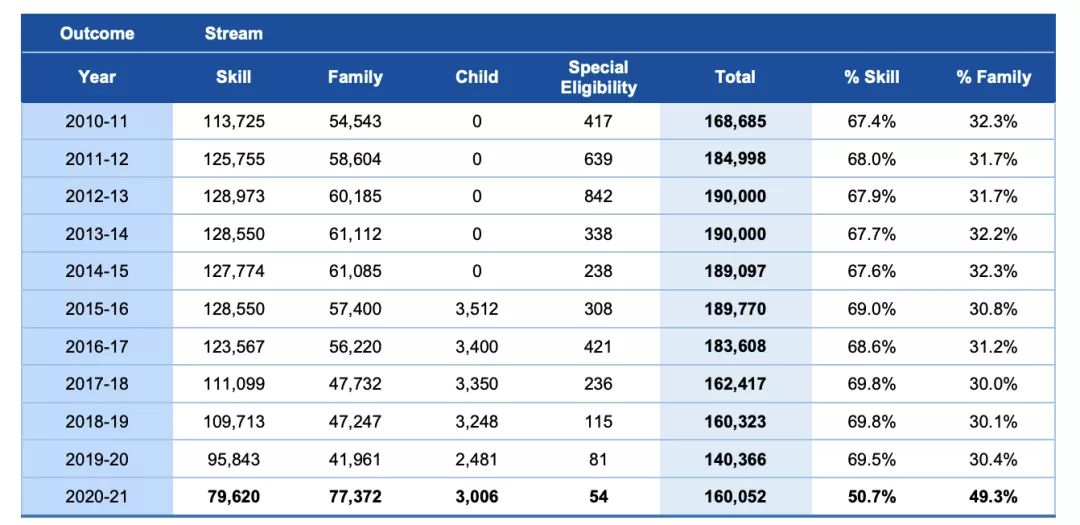 與過往財年相比,2020-21財年技術移民發放量進一步縮減,家庭簽證發放量大增。