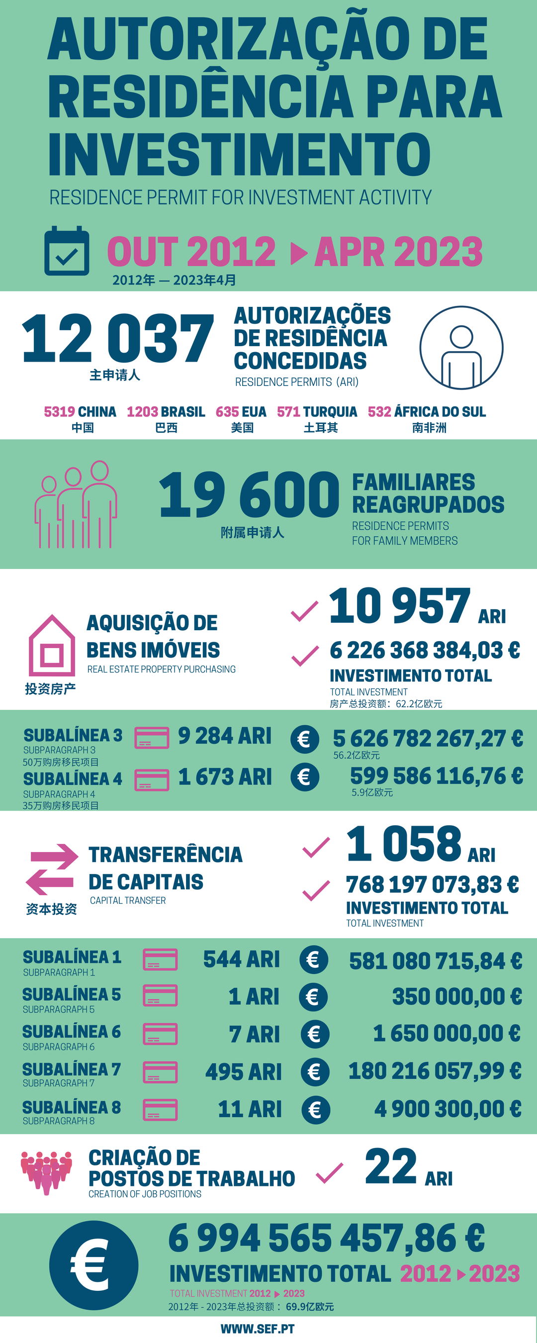 截至2023年4月,葡萄牙黃金簽證累計獲批主申請人12,037位,獲批附屬申請人19,600位。其中獲批的中國家庭已經(jīng)突破5,319,始終占據(jù)半壁江山;其次是巴西和美國。