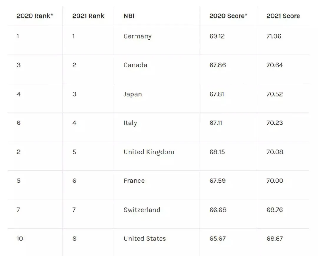 在2021年的60個參評國家中,德國連續第五年奪得NBI榜首,加拿大則從去年的第三名晉升至今年的第二名。
