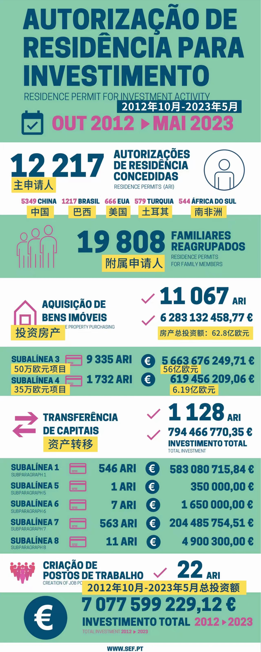 截至2023年5月,葡萄牙黃金簽證累計(jì)獲批主申請人12,217位,獲批附屬申請人19,808位。其中獲批的中國家庭達(dá)到5,349組,仍然占據(jù)半壁江山;其次是巴西(1217組)和美國(666組)。