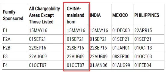 ·親屬移民排期表B,F2A類別前進了92天至2021年9月1日,其他類別無變化。