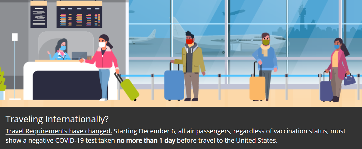 從12月6日起,赴美旅客需在完全接種(即全劑量接種滿14天整)后,憑疫苗接種憑證和登機(jī)前一天內(nèi)(此前為72小時(shí)內(nèi))新冠病毒檢測陰性證明登機(jī)。注意,這里的提前一天并不代表必須在起飛前24小時(shí)進(jìn)行檢測。如果旅客的航班是周五,可以帶著在周四任何時(shí)間段進(jìn)行的病毒檢測陰性證明登機(jī)。