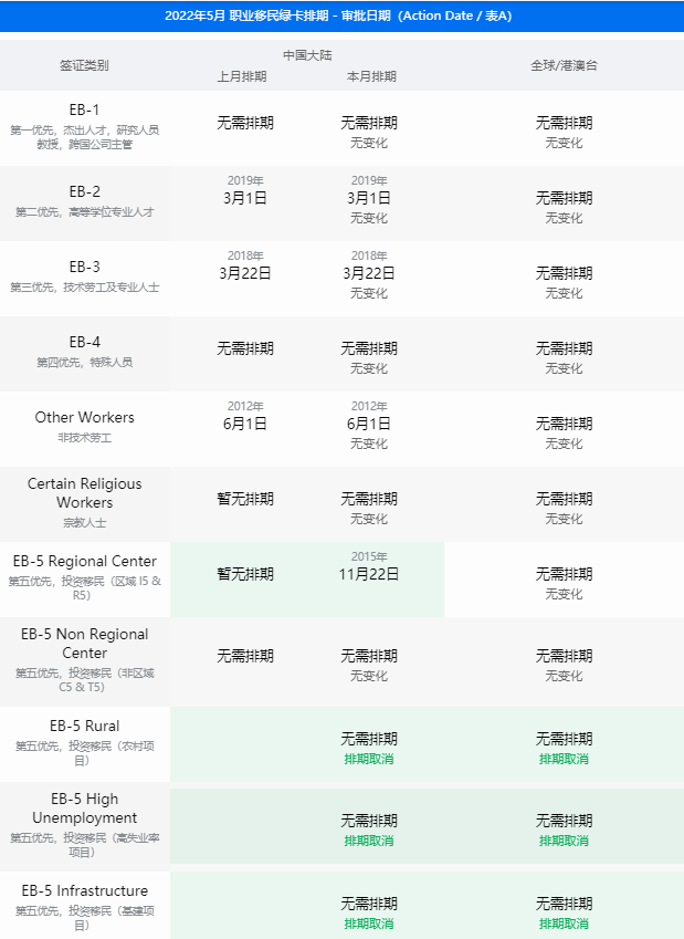 ·由于EB-5新政為三類項目(鄉村、高失業地區、基建)預留了簽證配額,他們成為排期表中的新成員,目前處于無排期狀態。