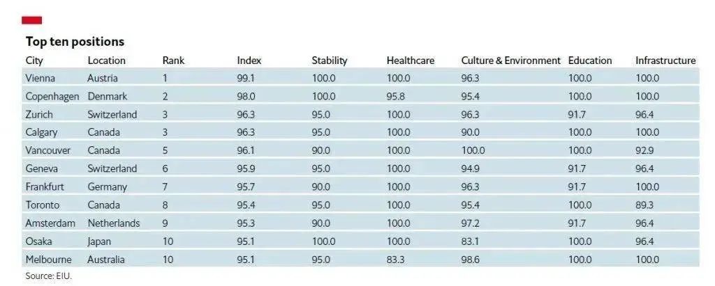 2022年全球最宜居城市排名出爐