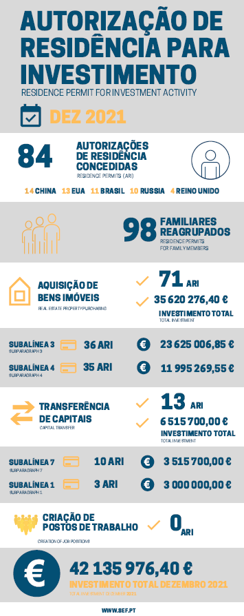 近日,葡萄牙移民局(SEF)公布了2021年12月的黃金簽證數(shù)據(jù)。2021年12月,共有84位主申請(qǐng)人和98位附屬申請(qǐng)人獲批葡萄牙黃金簽證。其中,來自中國的主申請(qǐng)人為14位,排名第一。其次是美國(13位)、巴西(11位)、俄羅斯(10位)、英國(4位)。