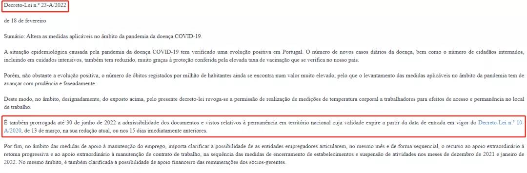 據葡萄牙部長理事會決議,于2022年2月18日登報生效的Decreto-Lei n.º 23-A/2022 法律,其中明確了2020年2月24日之后過期的居留卡,其有效期可自動延期至2022年6月30自上次延期至2022年3月31日后,此次延期時長再增3個月。