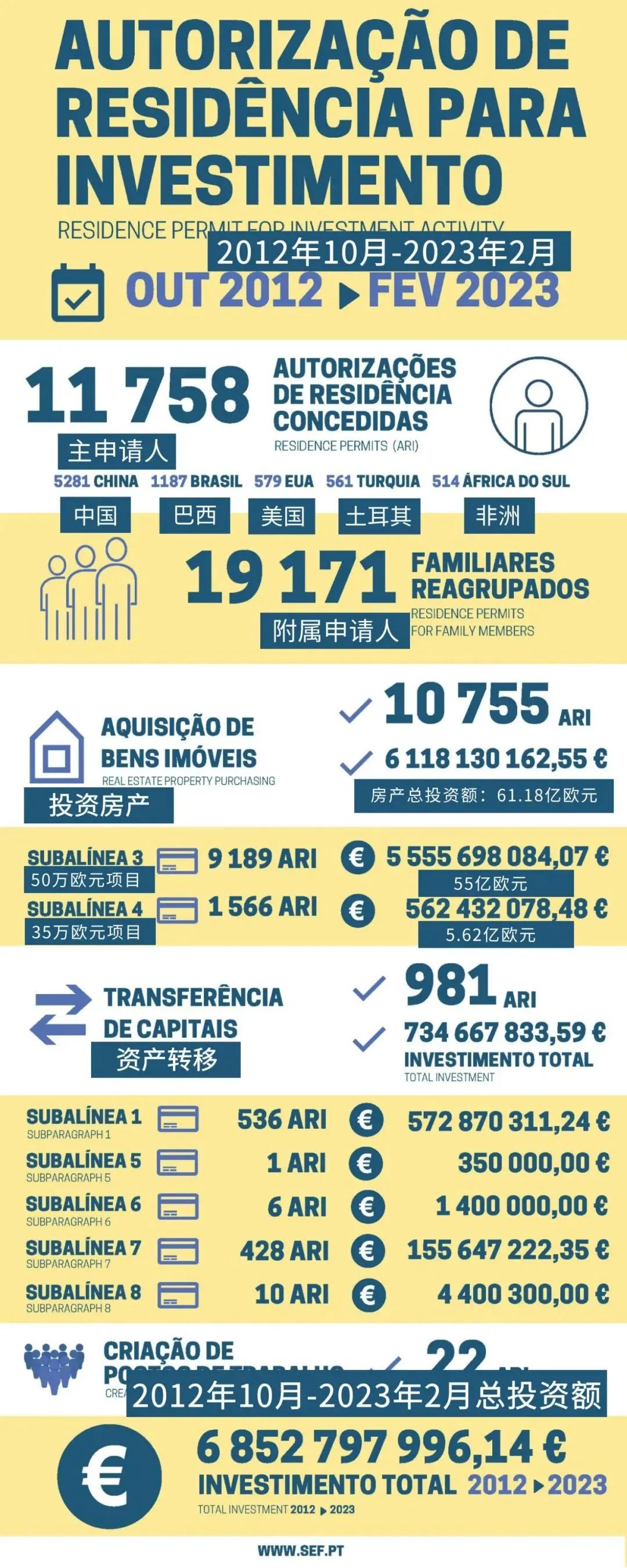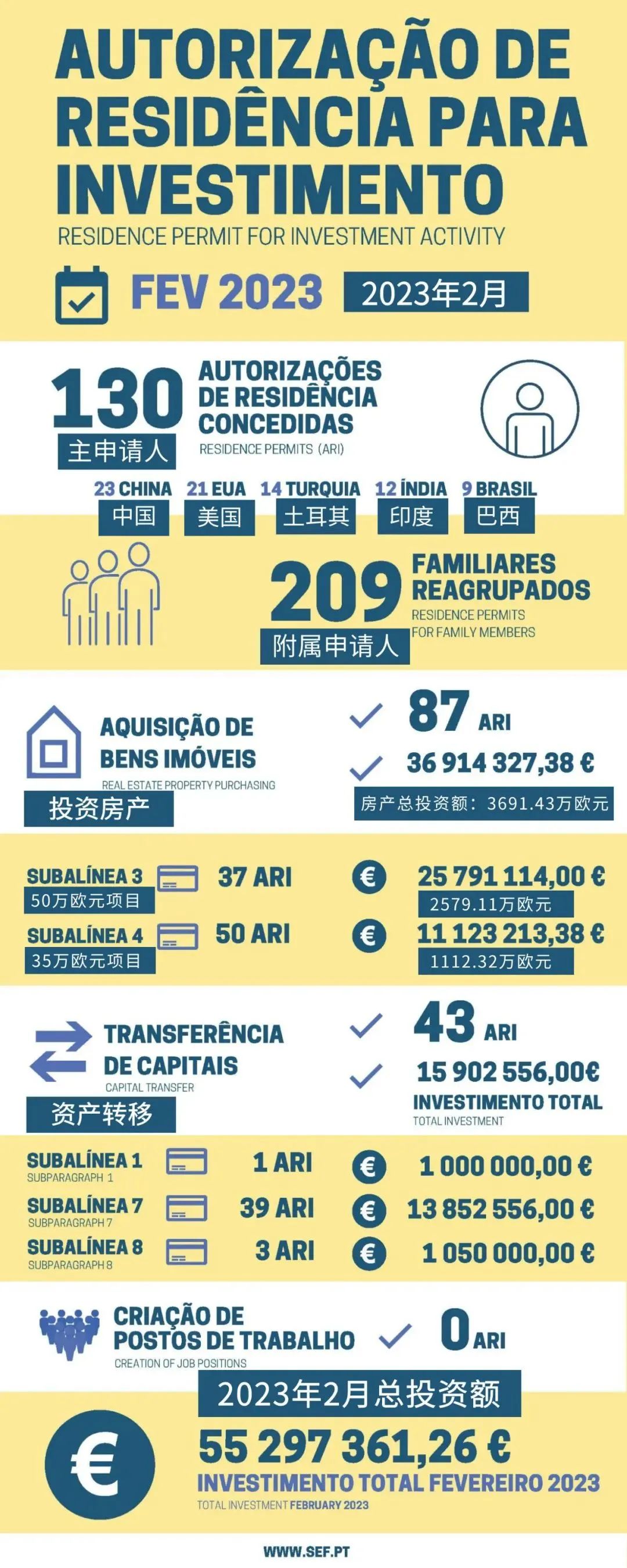 近日,葡萄牙移民局(SEF)公布了新的黃金簽證數據:2023年2月共有130位主申請人和209位附屬申請人獲批葡萄牙黃金簽證。其中,來自中國的主申請人為23人,在申請人國家中排在首位。其次是美國21人、土耳其14人、印度12人、巴西9人。