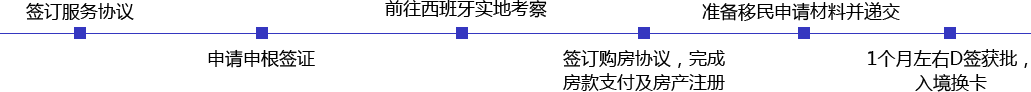 簽約前評估 → 評估通過,簽訂服務協議 → 準備律師授權資料 → 到轄區使領館簽署律師授權文件 → 準備移民申請材料 → 到大使館指定醫院體檢 → 到大使館遞交西班牙D類簽證申請資料 → 獲得3個月有效期的D類移民簽證 → 登陸西班牙辦理居住證明、錄入指紋 → 獲得西班牙非盈利居留卡