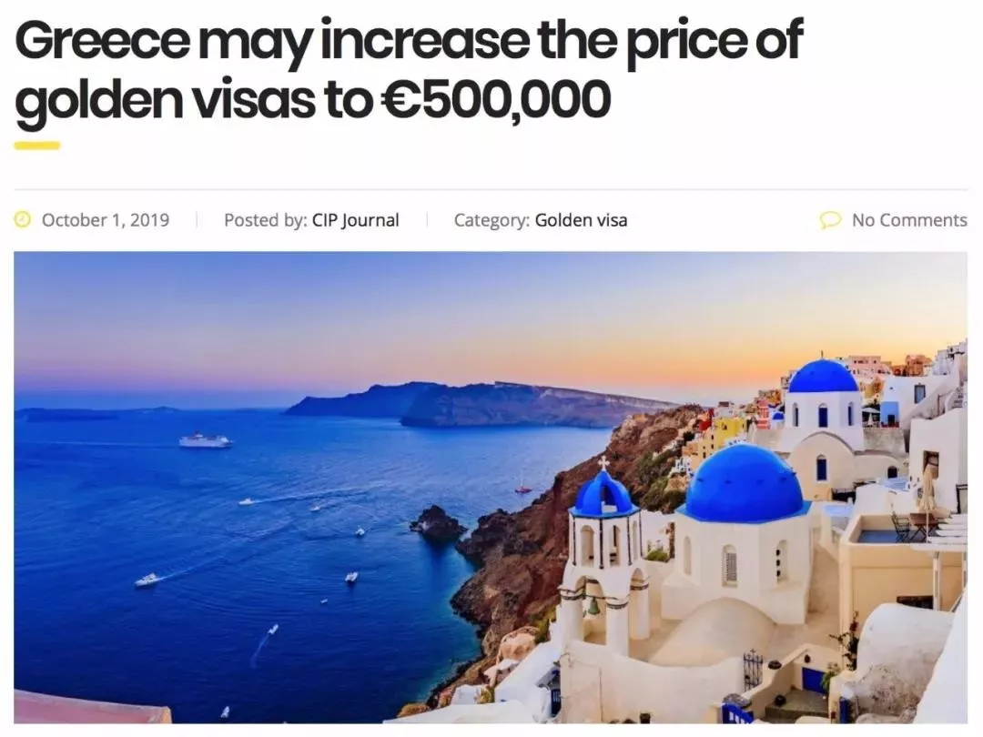 據希臘當地媒體Sofokleousin報道,希臘政府正在考慮重塑該國的黃金簽證項目,將目前要求的25萬歐最低投資額翻番至50萬歐,并引入強制居留要求和最低年度支出要求。