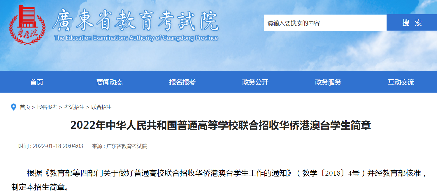 2022年1月18日,廣東省教育考試院發(fā)布了《2022年中華人民共和國普通高等學(xué)校聯(lián)合招收華僑港澳臺(tái)學(xué)生簡章》。那么,2022年華僑港澳臺(tái)學(xué)生全國聯(lián)招的報(bào)名條件、報(bào)名時(shí)間、考試科目、考試時(shí)間地點(diǎn)及志愿填報(bào)是怎樣的?下面我們一起來了解一下。